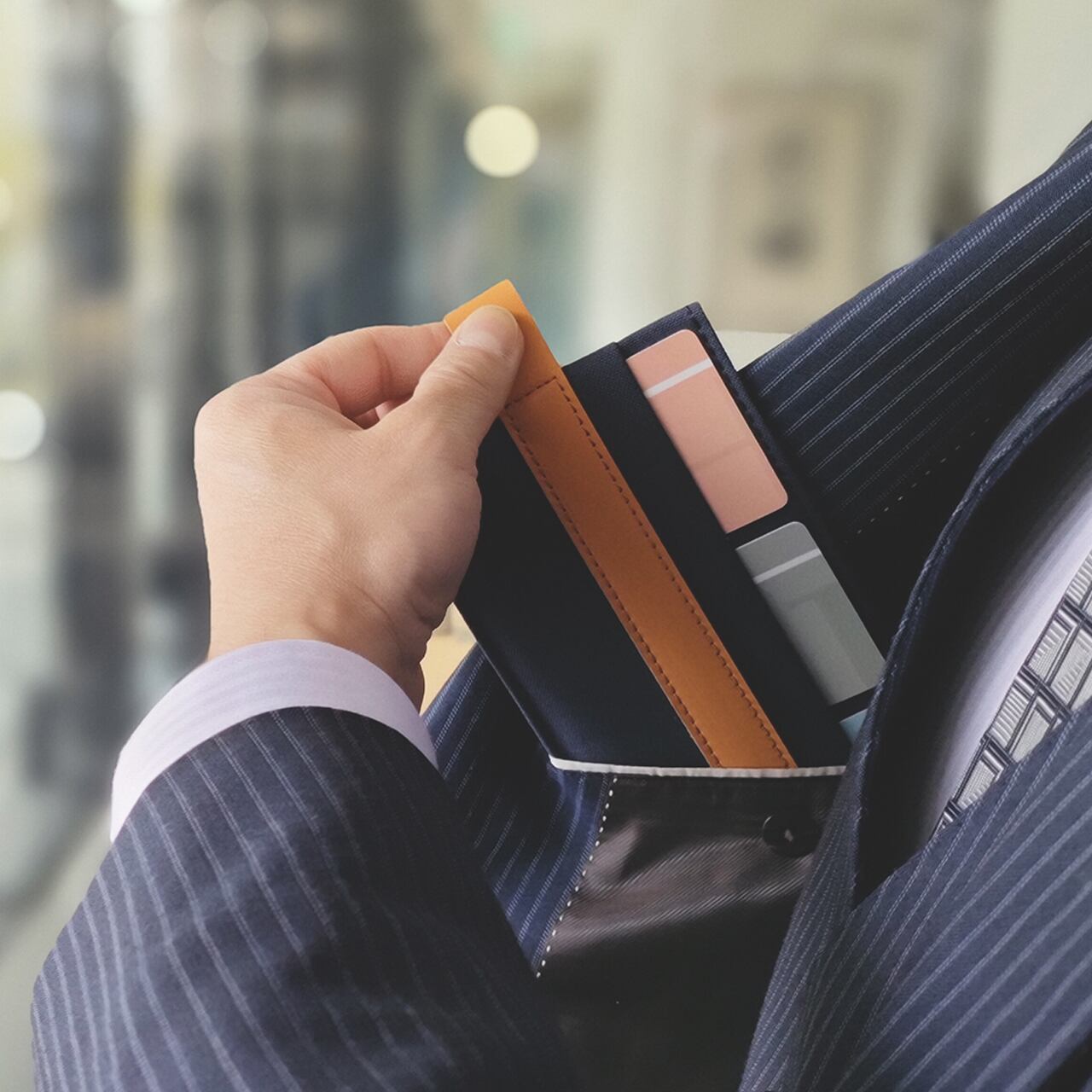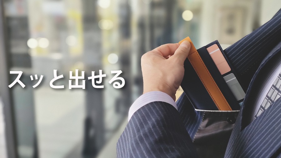 右利きの方はどうぞ「栞-ken-」をジャケットの右の内ポケットに収めてください。そして左手で「栞-ken-」を引き出し、右手で必要なカードを取り出してください。簡単な2ステップの所作で美しく目的のカードが取り出せます。(左利きの方は逆でお試しください。)
